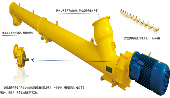 1、是由專用齒輪減速電機裝置與外殼管,螺旋總成依次相連,結合成一臺整套設備,移動、拆裝十分方便。