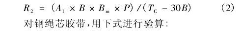 由式1可計算得出凹弧段的最小半徑。但是當膠帶的張力過低時,膠帶的邊緣處有可能產生皺曲,將無法保證皮帶輸送機的安全運行,因此需對該半徑值進行必要的校核。鑒于目前國內尚無成熟的計算公式可循,建議采用美國輸送設備制造商協會聯合會推薦的公式對最小半徑進行驗算,以保證膠帶具有足夠張力,避免在凹弧段處的膠帶邊緣出現零張力'對織物芯膠帶,用下式進行驗算: